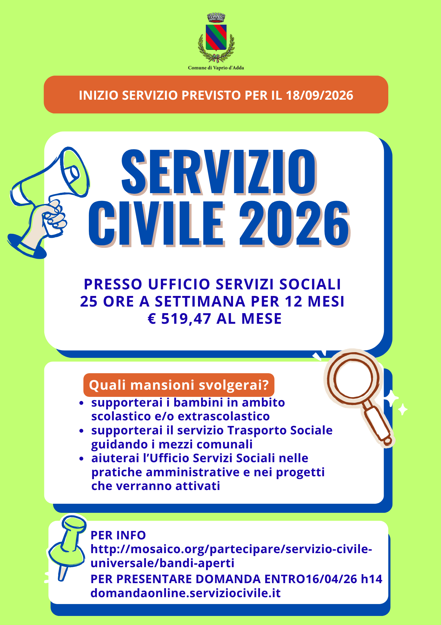 E' aperta e viene prorogata al 16/04/26 (ore 14:00) la selezione per n.1 posizioni per il Bando di Servizio Civile Universale 2026 presso l'Area Servizi alla Persona, con avvio del candidato previsto per il 18/09/2026.
